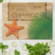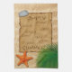 Old parchment paper with palm leaf, stone and starfish on beach sand background.