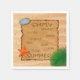 Old parchment paper with palm leaf, stone and starfish on beach sand background.