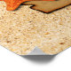 Old parchment paper with palm leaf, stone and starfish on beach sand background.