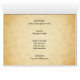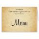 A wedding menu design with a printed background design in the style of vintage old paper, designed to look similar to a faux parchment pattern. The background is a pattern print in yellowy beige / tan colors. There is stylish black text that can be personalized.