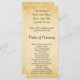 A wedding program design with a printed background design in the style of vintage old paper, designed to look similar to a faux parchment pattern. The background is a pattern print in yellowy beige / tan colors. There is stylish black text that can be personalized.