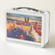 This is a standard metal lunchbox that appears to work just fine. We designed this box ourselves with an uploaded photo and custom text on the front and back. It looks absolutely beautiful except the front of the lunchbox is not centered like it shows in the photo. The print borders don't align with the inset flat part of the box where the preview photo online showed it perfectly centered in there. The back looks nice and centered though.