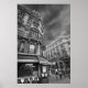 A black & white duotone image featuring a popular local cafe close to the River Seine with patrons walking in the typically Parisian fashion on the street. A beautiful cafe that is reminiscent of turn of the century charm is surrounded by typical Parisian architecture.