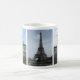 A mug with three photos of famous sites in Paris: The Sacré Coeur on the Montmartre hill, the Eiffel Tower, and the Arc de Triomphe seen from the Champs Elysées.