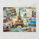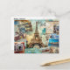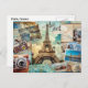 Postcard is shown with a collage print of the sights of Paris, France with vintage cameras.