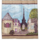 This landscape cityscape painting is art by Kristie Hubler, inspired by the Eiffel Tower, Paris, France, and the indoor shop facades of Paris Las Vegas, in the impressionism technique, with the art's round tower & Mansard roof building on the left side, and the right side with the twisted French oak tree on the right. Has a tan latte colored top & bottom border, edged with a cocoa stripe top & bottom border.