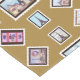 Paris / Eiffel Tower inspired postage stamps on tan background field on table runner, art by Kristie Hubler, inspired by the Eiffel Tower, Paris, France, and the indoor shop facades of Paris Las Vegas, in the pointillism technique, developed by French artist Georges Seurat, the painter of La Grande Jatte hanging in the Metropolitan Museum of Art in NYC, and impressionist style