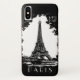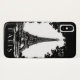 Customizable iPhone 4 case with black and white art design featuring a grunge vintage style illustration of the Eiffel Tower in Paris, France. You can personalize this case with your own custom text or keep / clear the existing text.