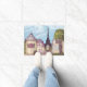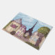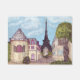 This landscape cityscape painting is art by Kristie Hubler, inspired by the Eiffel Tower, Paris, France, and the indoor shop facades of Paris Las Vegas, in the impressionism technique, with the art's round tower & Mansard roof building on the left side, and the right side with the twisted French oak tree on the right