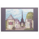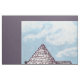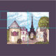 Lke a fabric tapestry, this by the yard fabric, with art by Kristie Hubler, inspired by the Eiffel Tower, Paris, France, and the indoor shop facades of Paris Las Vegas, in the impressionism technique, with the art's round tower & Mansard roof building on the left side, and the right side with the twisted French oak tree on the right.