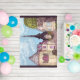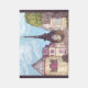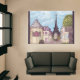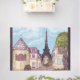 This rug has my hand painted, rendered art, "Paris Eiffel Tower Inspired landscape" in the impressionist style, with the famous Eiffel Tower from Paris, France, with swirling clouds in the sky and a cityscape rendered perspective of houses, shops, and buildings, Mansard roof, conal roof French round buildings, paver sidewalks, a twisted cool tree, all in the impressionism style made famous in the 1870s, also part of the impressionism movement. The sides have dark gray ish lavender borders.