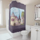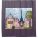 This shower curtain has art by Kristie Hubler, inspired by the Eiffel Tower, Paris, France, and the indoor shop facades of Paris Las Vegas, in the impressionism technique, with the art's round tower & Mansard roof building on the left side, and the right side with the twisted French oak tree on the right, with a dark gray lavender border