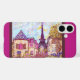 Paris Eiffel Tower pointillism iPhone case, art created by Kristie Hubler, inspired by old photos of Paris, France, the Eiffel Tower, and the shop facades inside Paris Las Vegas resort and casino, when I visited in 2001. Also inspired by 19th century French pointillist painting artist George Seurat, and his painting, "La Grande Jette", hanging in the Metropolitan Museum of Art in NYC. Has berry colored orchid magenta top and bottom borders.