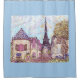 This shower curtain has art by Kristie Hubler, inspired by the Eiffel Tower, Paris, France, and the indoor shop facades of Paris Las Vegas, in the pointillism technique, developed by French artist Georges Seurat, the painter of La Grande Jatte hanging in the Metropolitan Museum of Art in NYC, with light blue border.