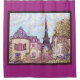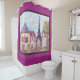 This shower curtain with berry orchid color background, with a dark brown border around it, has art by Kristie Hubler, inspired by the Eiffel Tower, Paris, France, and the indoor shop facades of Paris Las Vegas, in the pointillism technique, developed by French artist Georges Seurat, the painter of La Grande Jatte hanging in the Metropolitan Museum of Art in NYC