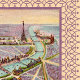 This elegant and unusual Victorian trade card image, awash in a beautiful lavender color, describes the layout of the 1900 Expo in Paris, France. A collection of boats travel lazily along the aquamarine blue Seine. A colorful, pink-tinted sky compliments the soft lavender colors of the central illustration.