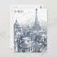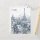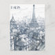 This travel postcard, in hand drawn sketch-style, showcases a view of Paris' skyline alongside with the Eifel Tower.