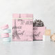 The Eiffel Tower, the words "Joyeux Noël" (Merry Christmas in French), Paris in vintage typography, and vintage French labels for champagne and cocoa and sprigs of vintage holly in black on a pretty pink make lovely and interesting Christmas gift wrap, for your French themed holiday.