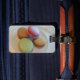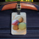 French macaroons in various flavors and colors on a white plate create a fun personalized luggage tag. Photographed in Paris.