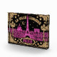 Paris rendered in electric rose pink and warm champagne gold neon — the Eiffel Tower and full cityscape in rose pink, ornate Parisian street lamps and La Ville Lumière arch text in champagne gold. The romantic dual neon palette glows beautifully through the clear acrylic.