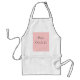 The apron is of very good quality. I used it while icing cookies. The dark colored icing washed off of the apron very well! The neck strap is sturdy and easy to resize on the adult size apron. The print was clear and well defined. I am glad I was able to personalize with name.