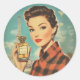 A glamorous 1950s vintage poster featuring a sophisticated woman in red plaid holding a luxurious perfume bottle labeled “PARFUM.” The Eiffel Tower rises in the background, enhancing the chic Parisian aesthetic with bold colors, retro fashion, and classic beauty.