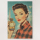 A glamorous 1950s vintage poster featuring a sophisticated woman in red plaid holding a luxurious perfume bottle labeled “PARFUM.” The Eiffel Tower rises in the background, enhancing the chic Parisian aesthetic with bold colors, retro fashion, and classic beauty.