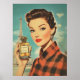 A glamorous 1950s vintage poster featuring a sophisticated woman in red plaid holding a luxurious perfume bottle labeled “PARFUM.” The Eiffel Tower rises in the background, enhancing the chic Parisian aesthetic with bold colors, retro fashion, and classic beauty.