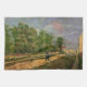 Outskirts of Paris: Road with Peasant Shouldering a Spade by Vincent van Gogh is a vintage fine art post impressionism daily life portrait painting featuring a peasant farm worker wandering a tree lined dirt road in the suburbs of Paris, France carrying a shovel.