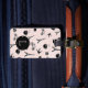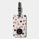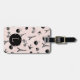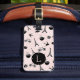 Escape to Paris with our tres chic personalized luggage tag! Front features your single initial monogram on a background pattern of Eiffel tower silhouettes, macarons, croissants, birds, roses, bicycles and coffee cups in black on pastel blush pink. Add your full contact details to the reverse.