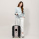 Escape to the city of lights with our chic Paris inspired luggage in romantic blush pink and crisp black. Sleek black suitcase features a center patterned panel with tiny birds, croissants, macarons, roses, coffee cups, and of course, the Eiffel tower, in black and white on a pale blush background. Personalize with a single initial monogram if desired.