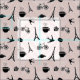 Chic Paris inspired fabric features a pattern of tiny birds, croissants, macarons, roses, coffee cups, and of course, the Eiffel tower, in black and white on a pale blush pink background, for a sweet and whimsical take on the timeless city. A perfect choice for adding feminine Parisian flair to your home or crafting projects!