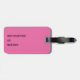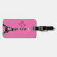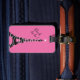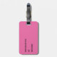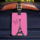 A bright pink luggage tag accented with the Eiffel Tower, lit up at night.