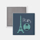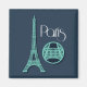 This art features a design of the Eiffel Tower in teal on a dark blue background.