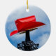 Two sided ornament featuring the Eiffel Tower of Paris, Texas on one side and a close up of the red hat on the other.
