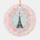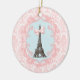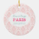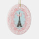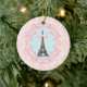 This design is inspired by Paris, city of fashion and light! It features the famous eiffel tower in vintage illustration style, where a light pink ribbon graciously lays on the top to add a girly touch. The background is made of light blue and white polka dots and pink and white damask. Finally, it is framed by a vintage style frame in pink swirls. Keep your romantic travel to Paris memories always close to you with this adorable ornament. You can change the model text on the back by entering your name and travel date.