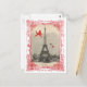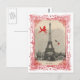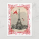 A sweet red cupid flies around the Eiffel Tower from an antique French postcard sending his arrows of love to all the Parisians and visitors to Paris below, surrounded by a fancy vintage French frame image.