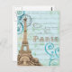 A vintage sepia image of the Eiffel Tower from the Paris expostion in the 1800s appears with a vintage Paris handwritten address and postmarks and text from Victor Hugo's Notre Dame du Paris on a background with faint branches and leaves in aqua. Matching items and many other vintage Paris designs are available in my Zazzle store.
