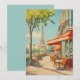 A charming Paris street café with rattan chairs and red awnings, set against a clear blue sky and a stunning view of the Eiffel Tower. Lush greenery and blooming flowers complete this idyllic scene, perfect for lovers of vintage travel art.
