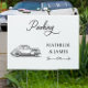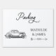 Wedding parking sign, personalized with bride and groom names. Design features elegant calligraphy and is illustrated with hand drawn wedding reception icon of a tower of a wedding car, with a whimsical direction arrow. The design is shown in black and white but you are welcome to change the background color to suit your wedding (edit using the design tool.) Please browse our Wedding Direction Signs collection for alternative designs.