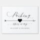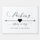Simple Elegant Calligraphy Script Wedding Parking This way Arrow pointing Left Directional Sign, in beautiful flowing fancy letters and your personalized names. A stylish yet simple formal design in black and white or any background color you choose. Just click the customize further link, shown under the text personalization area on the right, and choose your custom color background. This sign poster template makes it fast and easy to create stunning additions to your wedding decor. Signs can be enlarged, there are many sizes to choose from, as well as options for custom framing and matting. Wedding this way custom signage.
