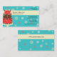 Bakery, desserts business card featuring a blue large muted circles background, delicious and red cake stack with circles and a tan bow. This food business card is fully customizable. Simply personalize the provided text with your desired information.