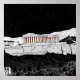 I landscape illustration of the Parthenon in Greece. This iconic site is a temple high above Athens. A black and white design which has the Parthenon, Acropolis letter with night lights.