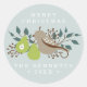 Perfect for your holiday cards, invitations and gifts, these festive round stickers feature a tan partridge bird and green pear illustration, flanked by winter greenery on an icy blue green background. Personalize with your custom message, name and the year in white lettering. Designed to match our Partridge and Pear card and accessory collection.