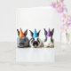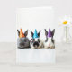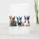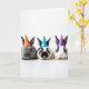 This card shows three small, soft-furred animals posed side by side on a bright white background, each wearing a tiny cone party hat that adds a sweet Easter touch 🐰. The left animal has a charcoal-gray coat and an orange hat with white dots, leaning slightly toward the middle as if keeping close. In the center, a black-and-white companion wears a sky-blue dotted hat and faces forward with wide, glossy eyes that feel quietly affectionate. On the right, a mostly white animal with dark markings wears a purple dotted hat, completing the trio like friends gathered for a photo 🐇. The lighting is bright and even, bringing out the fine texture of their fur, the soft curve of their ears, and the gentle shine on their noses. Any greeting text would sit above their heads in a light spring color, with a smaller line near the bottom in a softer shade to keep the focus on their faces 🌷. The hats line up in orange, blue, and purple, each sprinkled with small white polka dots against the stark white space.