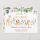 This cute birthday invitation features watercolor safari animals with floral and leaf accents and faux gold foil confetti.