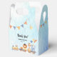 Add a special touch to your little boy or girl's big day with this custom jungle-themed birthday party thank you favor box. There is a lion with a top hat, a giraffe with a bow tie, and an elephant with a party hat and balloons. All safari animals are painted in watercolor and are sitting on a train. The background is a soft blue watercolor. Text may be modified per your needs. Right now it says "Thank You!" and is followed by the kid name and age, and celebration date.