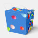 Festive favor boxes decorated with colorful party balloons floating in a bright blue sky.