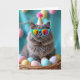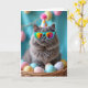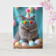 This card features a long-haired gray cat with plush fur, wearing a cone-shaped party hat striped in yellow and pink with a bright fuchsia pom on top. Aqua-framed sunglasses cover its eyes, and the iridescent lenses catch rainbow tones of orange, green, and purple, giving the cat a cool, slightly teasing look 🐇. The cat sits snugly in a rustic woven basket that’s filled to the brim with pastel eggs in soft pink, baby blue, pale yellow, and light lavender, some with gentle speckles. The close-up view feels like you’ve leaned in on a friendly little celebration, with the cat’s calm pose and festive accessories suggesting a warm, companionable mood. A short Easter greeting appears near the top in a light pastel color, with a smaller line of text tucked underneath in a softer shade for contrast 🌷. Soft, diffused lighting highlights the fluffy contours of the fur and the matte finish of the eggs without harsh shadows. Behind the basket, a sky-blue background fades into a blur with faint pastel shapes that echo the egg colors.