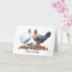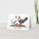 A pair of hen wearing party hats stand in a colorful pile of curly ribbons. Give someone this fun chickens birthday card.